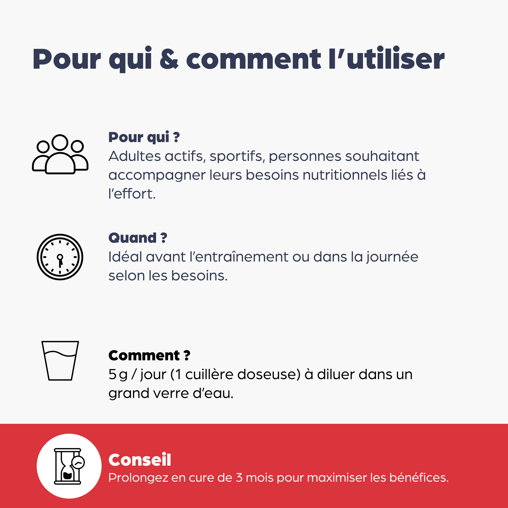 Ce format poudre permet d’ajuster la prise selon les besoins individuels et le niveau d’activité physique.