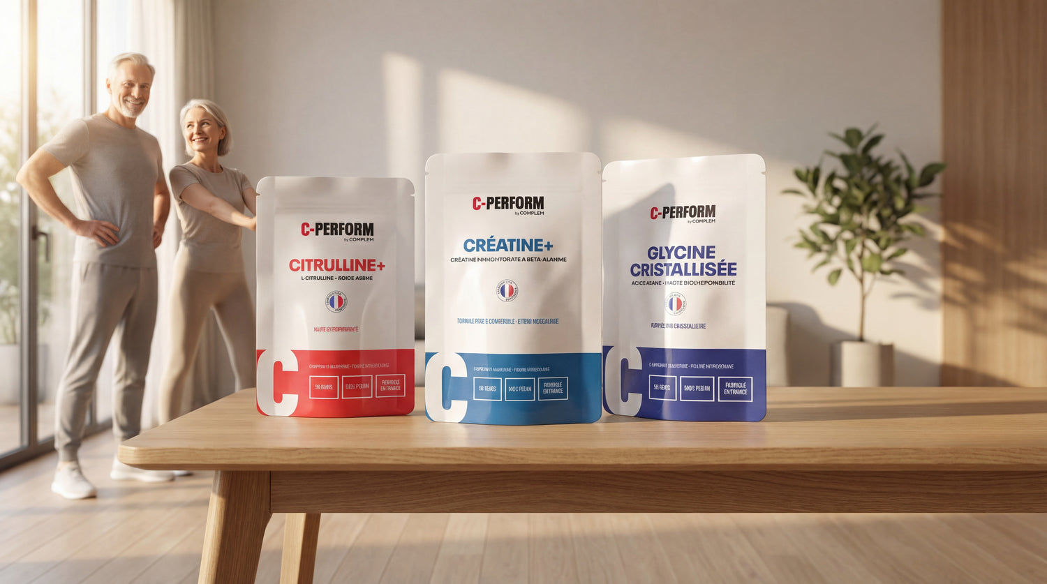 Le Pack Longévité+ COMPLEM associe trois actifs majeurs, couramment utilisés dans le cadre d’un accompagnement nutritionnel orienté performance, récupération et maintien des fonctions musculaires.